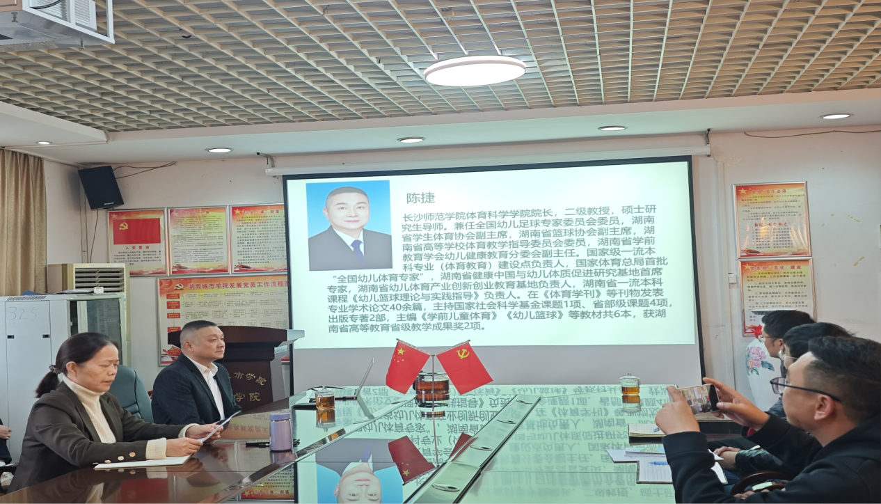 在体育馆一楼会议室,一场以“千锤百炼,百折不挠——体育教师在实践中的成长与锤炼”为主题的讲座吸引了众多体育专业学子和青年教师。本次讲座特邀长沙师范学院体育科学学院院长陈捷担任主讲。