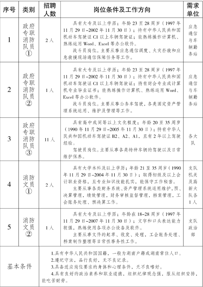 消防救援队伍承担着防范化解重大安全风险、应对处置各类灾害事故的职责使命,实行24小时驻勤备战模式,工作任务重、压力大、专业性强,为不断提高队伍保障水平,进一步加强人才队伍建设,依据《中华人民共和国消防法》《中华人民共和国劳动法》等有关法律规定以及《湖南省专职消防队伍管理办法》《益阳市消防救援支队政府专职消防员招录办法(试行)》等有关文件精神,现面向社会公开招录政府专职消防员17人:政府专职消防队员14人(其中退役士兵不低于40%)、消防文员3人。现将有关事项公告如下: